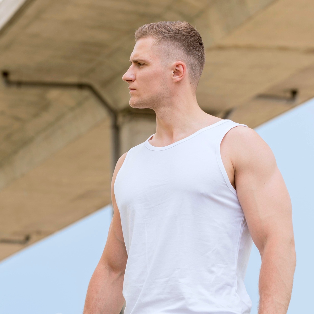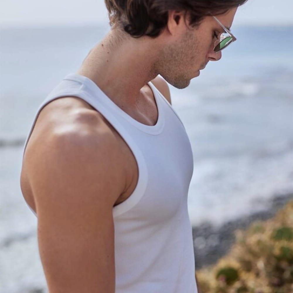 Koszulka na ramiączkach wykonana w 100% z miękkiej bawełny, świetnie przylega do ciała i podkreśla męską sylwetkę pozostawiając uczucie komfortu. Charakteryzuje się szerszymi ramiączkami, prążkowanym materiałem oraz okrągłym dekoltem.