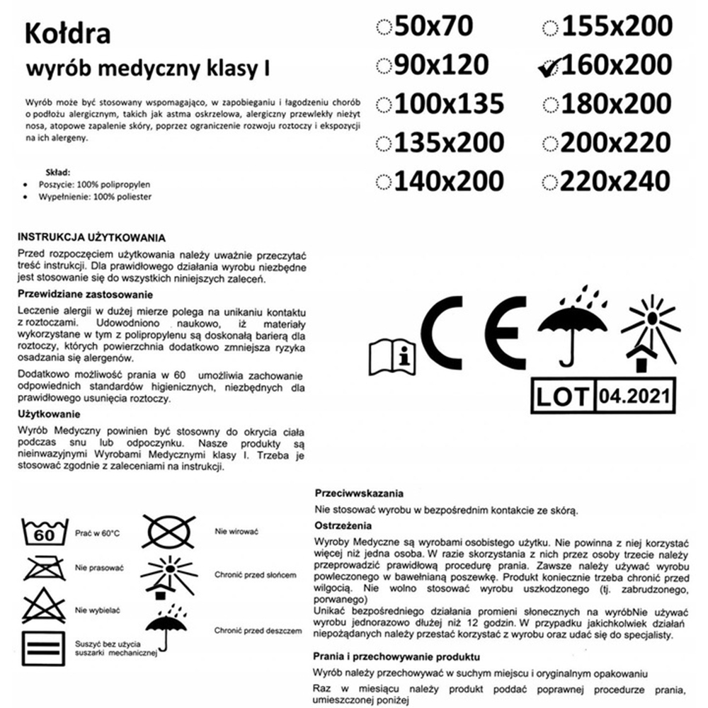 Kołdra posiada Certyfikat Europejski (znak CE) oraz została zakwalifikowana jako produkt medyczny I klasy.