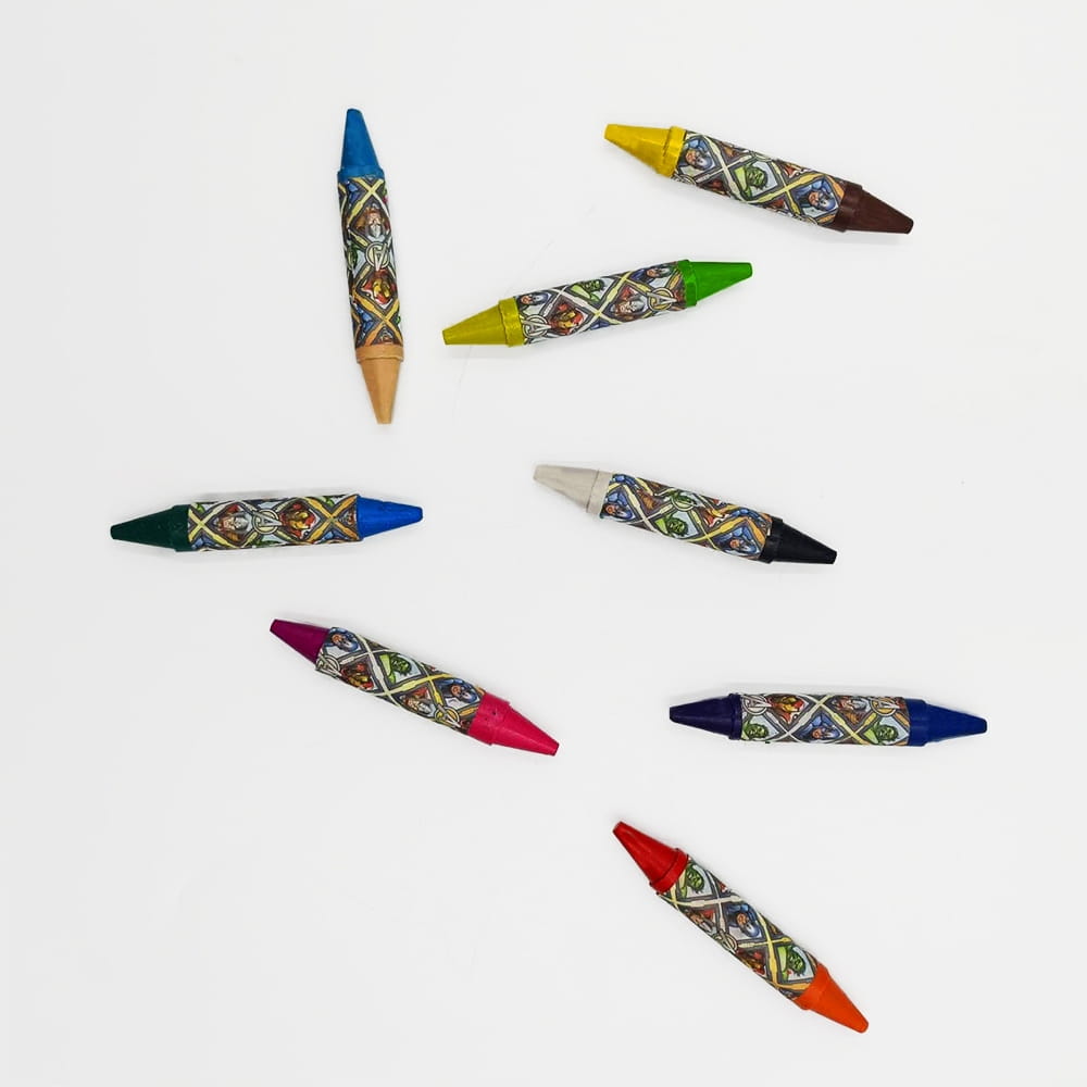 - kredki świecowe w papierowej otulinie zabezpieczającej przed pobrudzeniem rąk;