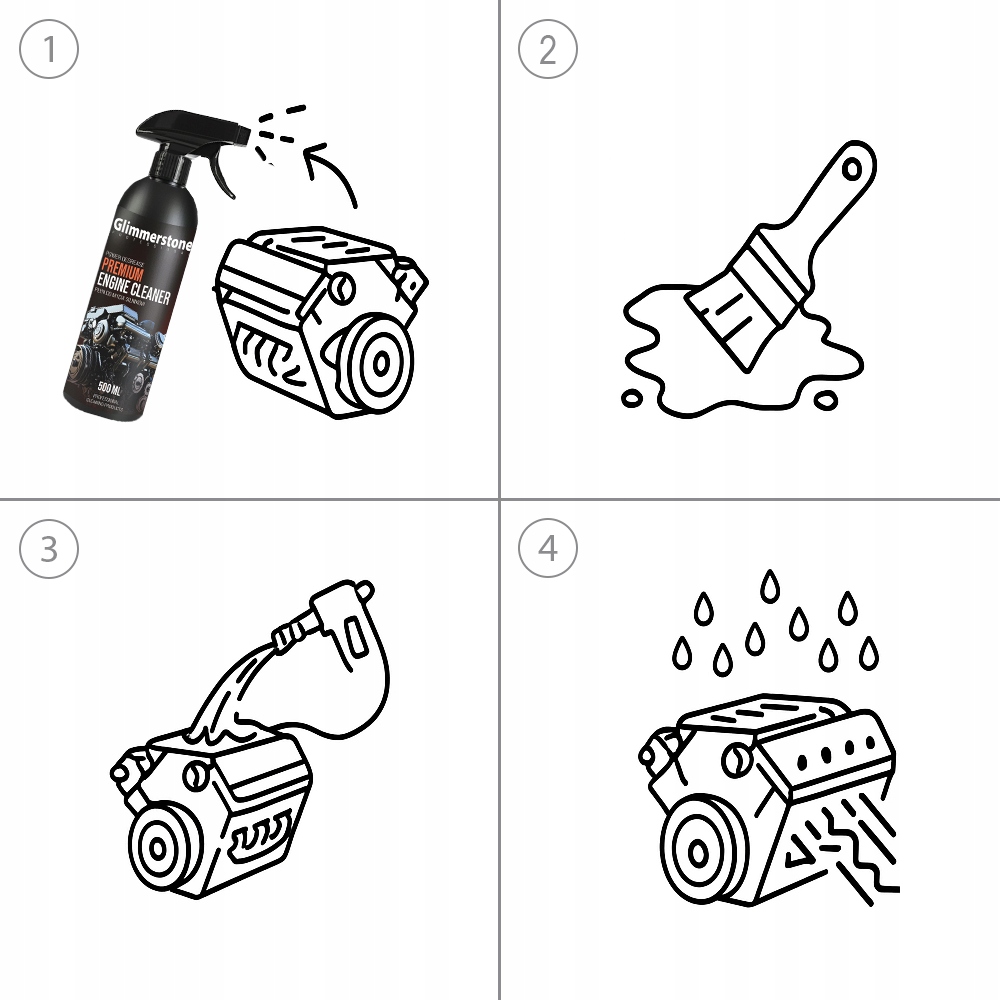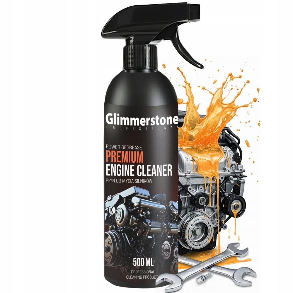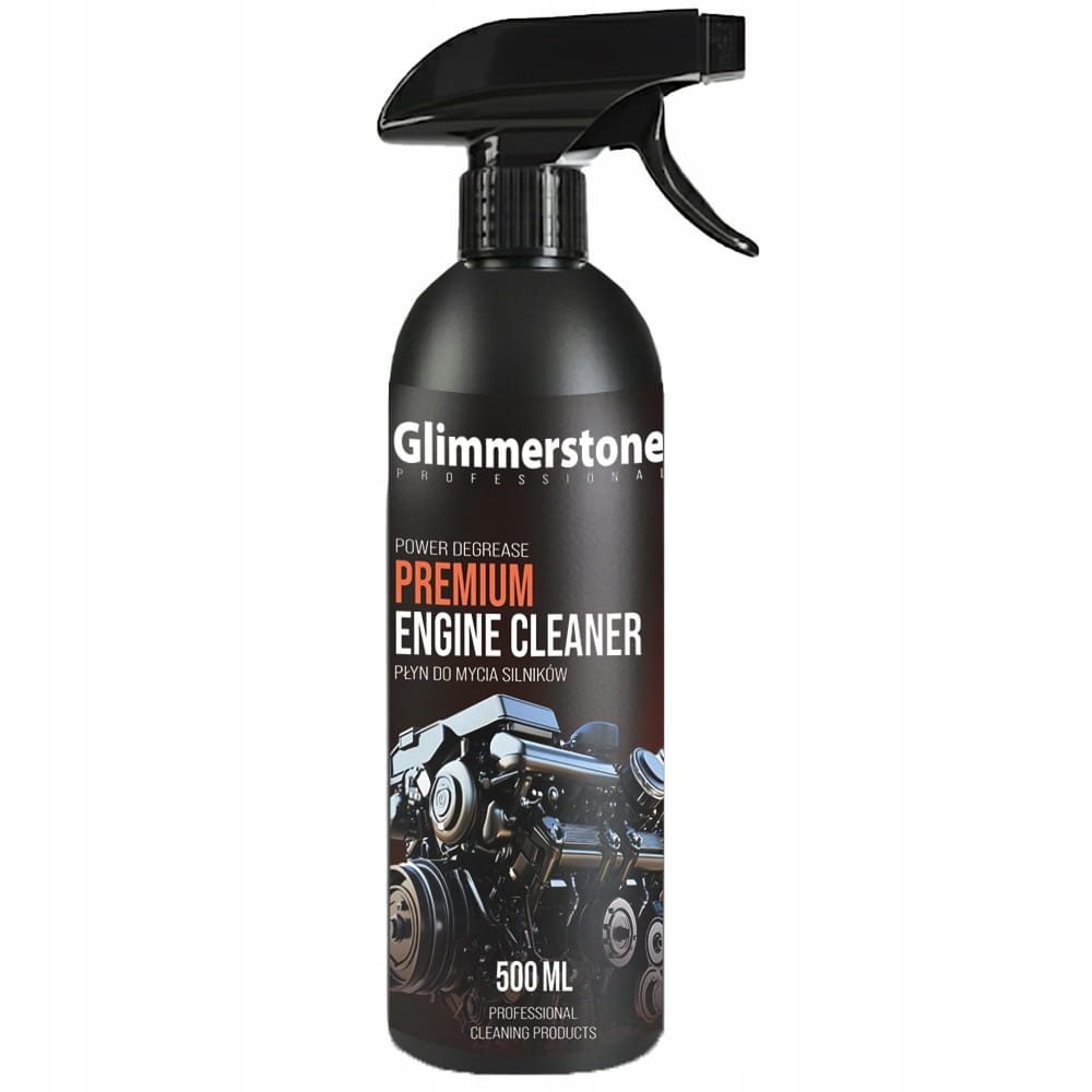 - Spryskaj zabrudzone miejsca preparatem Glimmerstone Professional Premium Engine Cleaner.