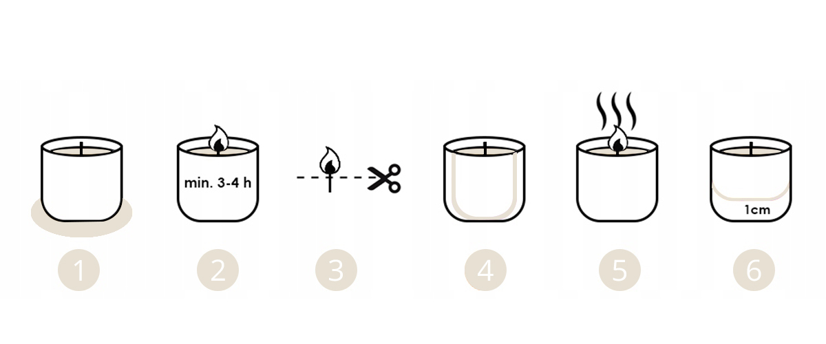 6️⃣ GDY WOSK SIĘ WYTOPI - Aby zachować pełne bezpieczeństwo zakończ palenie świecy, gdy na jej spodzie zostanie około 1cm wosku. Pozostałości wosku na dnie jest zjawiskiem normalnym i pozwala uniknąć uszkodzenia szklanego opakowania.