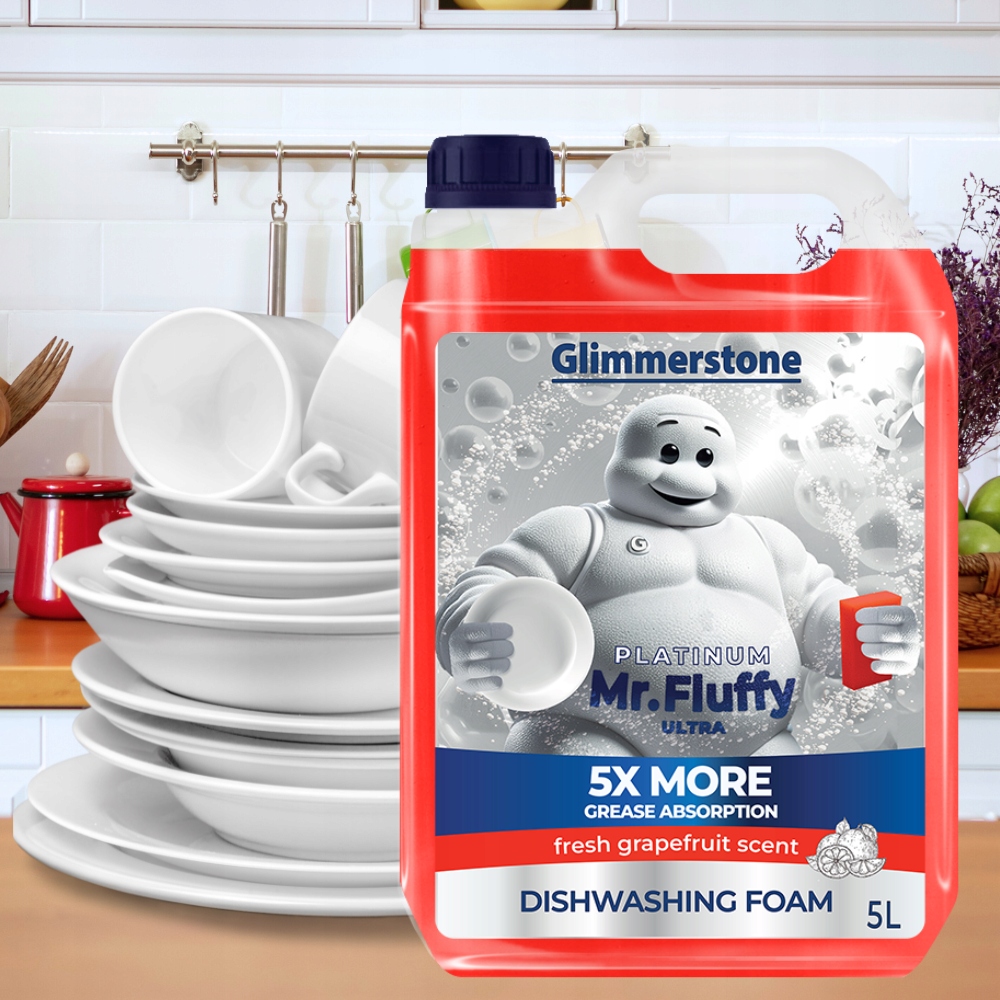 Pianka Mr. Fluffy nie pozostawia zacieków na umytych powierzchniach, nadaje im połysk bez konieczności wycierania do sucha.