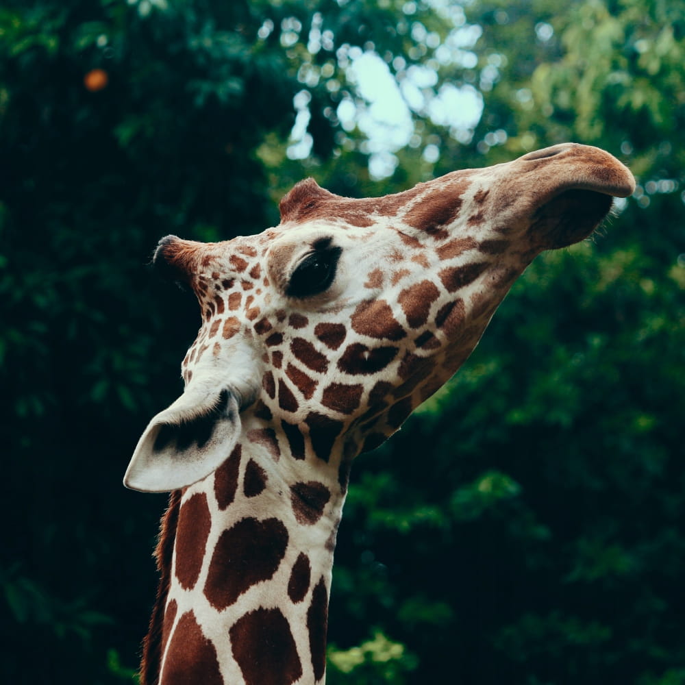Głowa żyrafy wystaje ponad klosz, tworząc dynamiczny efekt i zatrzymując uwagę wszystkich, którzy na nią spojrzą.