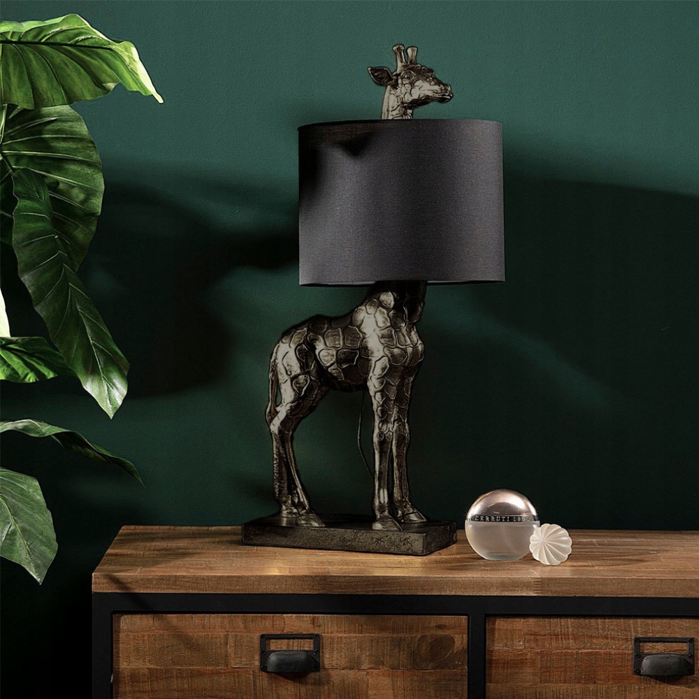 Efektowna lampa stołowa z podstawą w formie figury żyrafy częściowo „ukrytej” wewnątrz abażuru. Idealna do wnętrz surowych jak również eleganckich z elementami natury jak również klasycznych gdzie chcemy nadać akcent zwierzęcy.