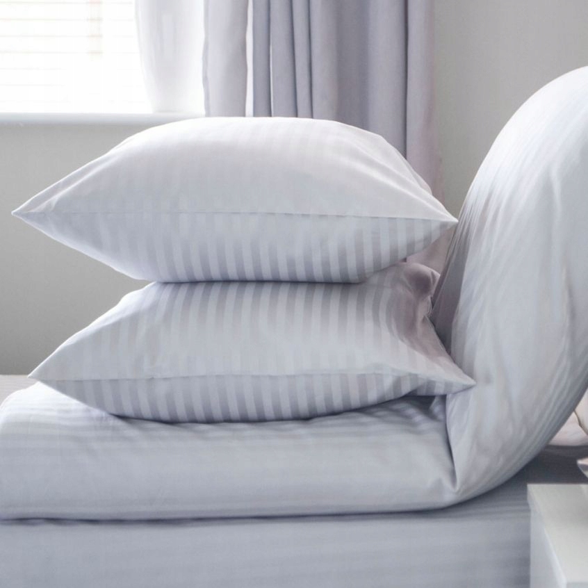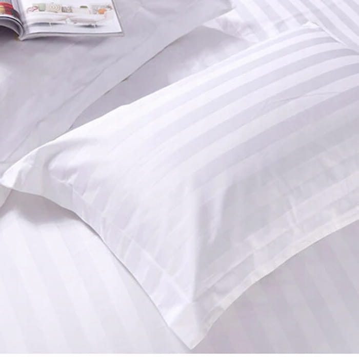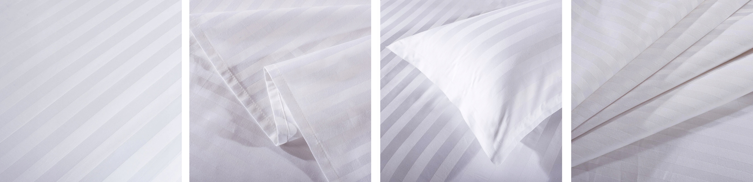 Pościel hotelowa ze specjalnymi zakładkami pozwalającymi na szybką łatwą zmianę kompletów. Pościel tkana w pasy o szerokości 1 cm.