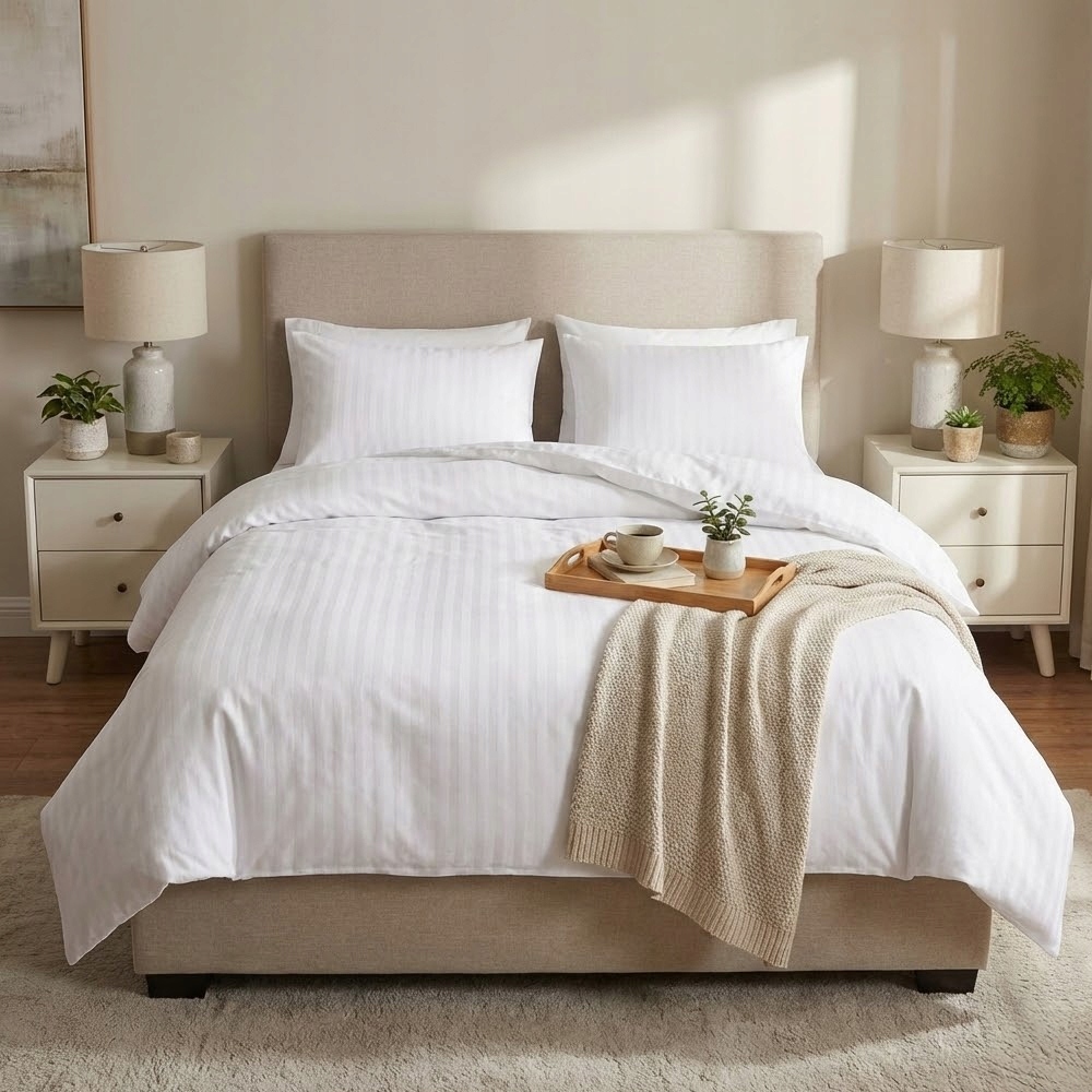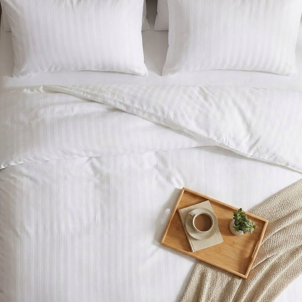 Pościel hotelowa ze specjalnymi zakładkami pozwalającymi na szybką łatwą zmianę kompletów. Pościel tkana w pasy o szerokości 1 cm.