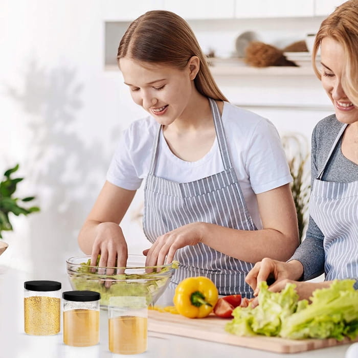 Słoik posiada szczelną nakrętkę, która zapobiega wyciekaniu przechowywanych ewentualnych płynów.