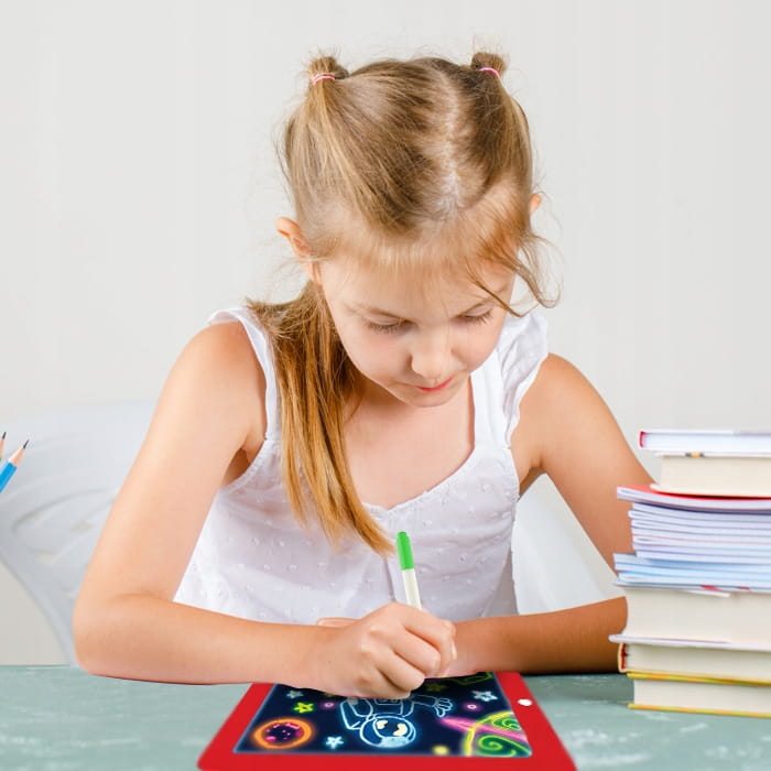 Zabawka posiada przezroczysty panel do rysowania za pomocą magicznych flamastrów. Podświetlenie LED może dodatkowo wzmocnić atrakcyjność wykonanych rysunków które będą się świetnie prezentować w przyciemnionym pomieszczeniu.