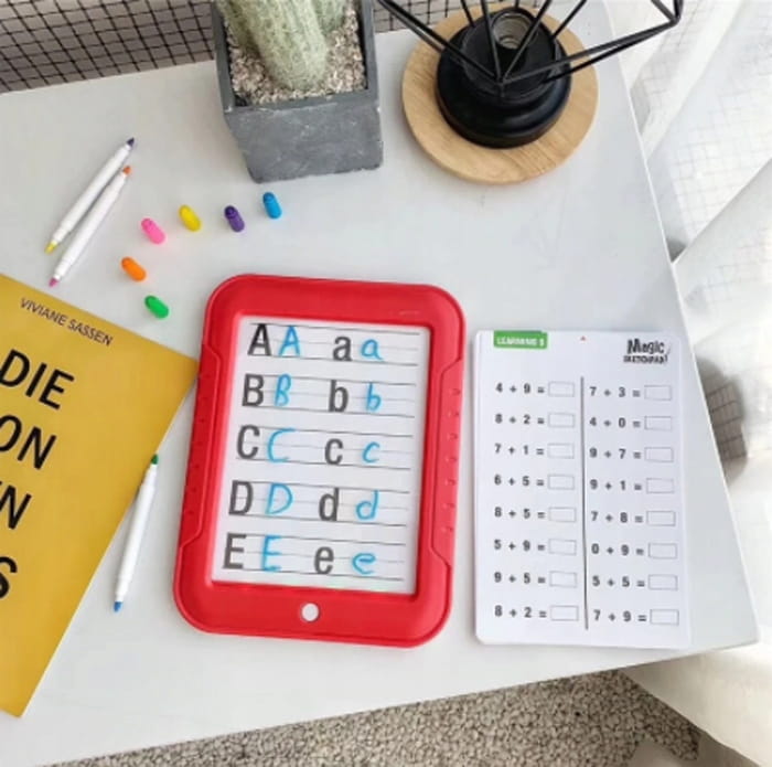 Do przezroczystego panelu można wsunąć jeden z szablonów dołączonych do zestawu. Pozwala to na dokładne przeniesienie rysunku na taflę. Jeśli rysunek nam się znudzi, można zmazać go za pomocą szmatki i sięgnąć po następny szablon. Produkt doskonale rozwija kreatywność oraz zdolności artystyczne u dziecka. Dodatkowo część z szablonów przedstawia proste zadania matematyczne i ortograficzne, dzięki czemu nauka wcale nie musi być nudna.