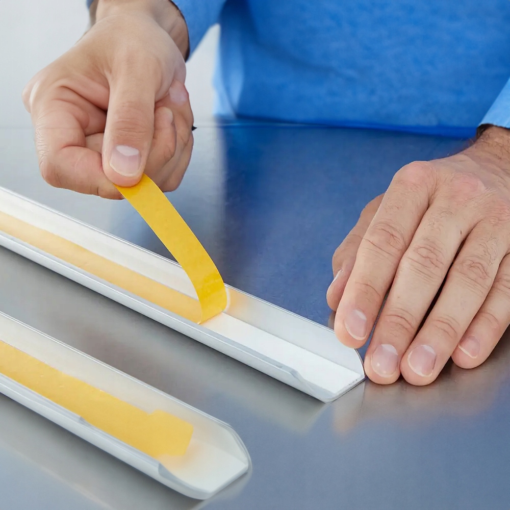 - Usunąć papier ochronny unikając dotykania palcami powierzchni klejącej.