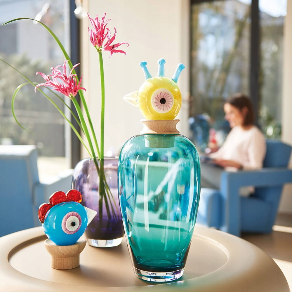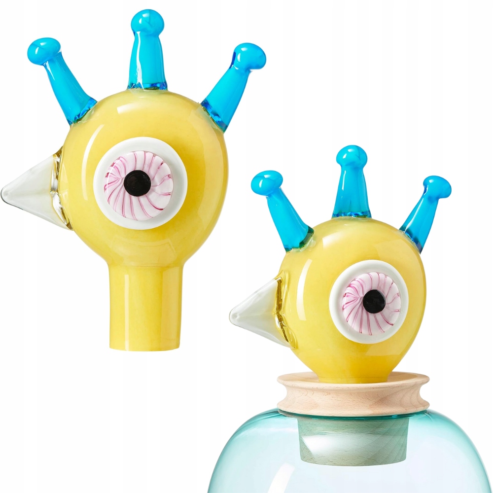 Podłużny, nieco pękaty wazon został zwieńczony drewnianą zatyczką, w której umieszczono kolorową głowę papugi. Dzięki temu po wyciągnięciu głowy możemy tworzyć niezwykłe kwiatowe kompozycje. Główka papugi została ręcznie wykonana z największą starannością.