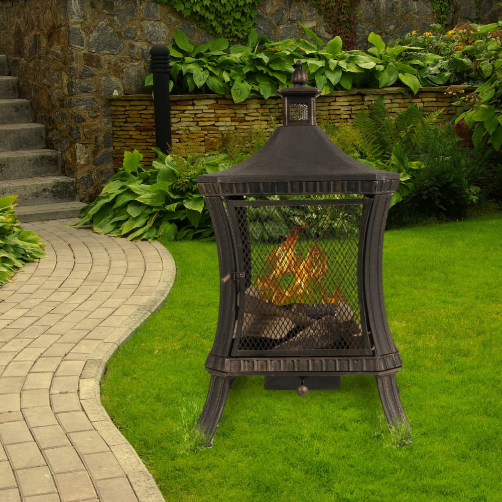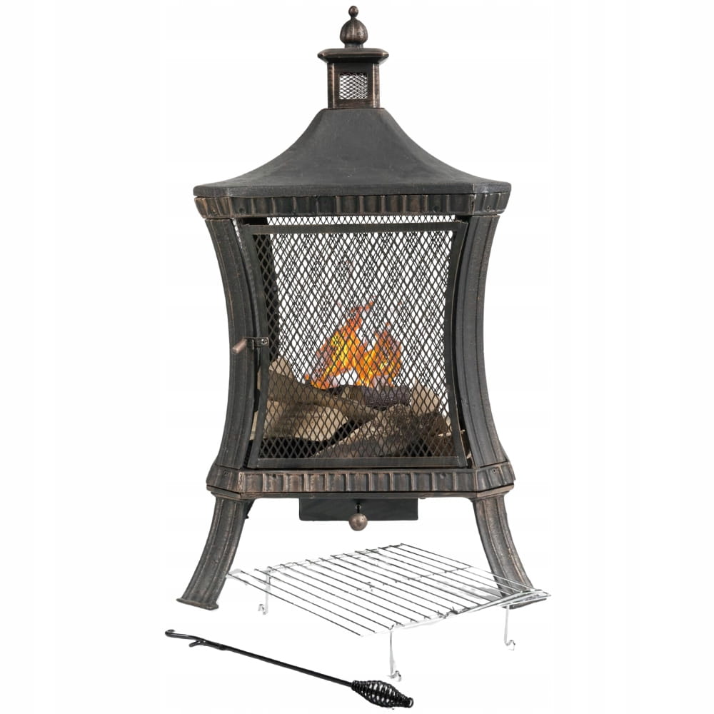 Piec w kolorze antycznego brązu zachwyca swoim kształtem i zdobieniami, stanowi on wizualną atrakcję. Dekoracyjny kominek ogrodowy gwarantuje bezpieczeństwo, dzięki solidnej misie paleniskowej z osłoną przeciwiskrową.