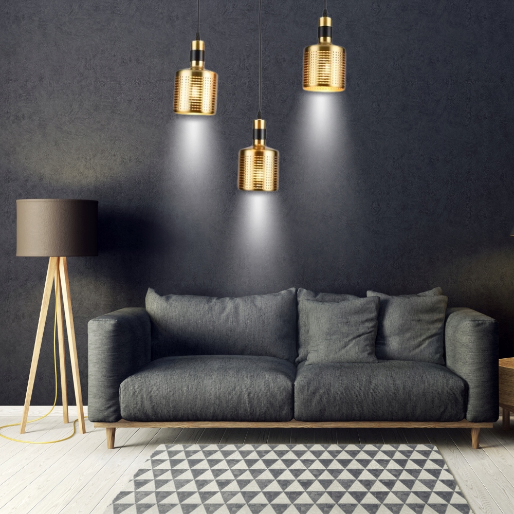 Bellis to lampa wisząca, której klosz ma cylindryczny kształt i jest gęsto perforowany, co pozwala na uzyskanie bardzo ciekawego efektu oświetlenia. Kolor klosza to połączenie złota z czarnym paskiem, co dodaje mu elegancji i stylu. Po włączeniu światła, dzięki perforacjom klosza, można uzyskać niezwykle ciekawy efekt świetlny, który dodaje przytulności i nastrojowości pomieszczeniu.